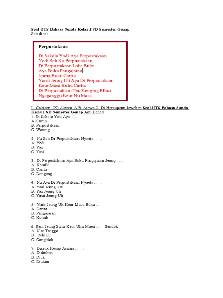 Latihan Soal Ukk Bahasa Sunda Kelas 1 Semester 2 Dan Kunci Jawaban