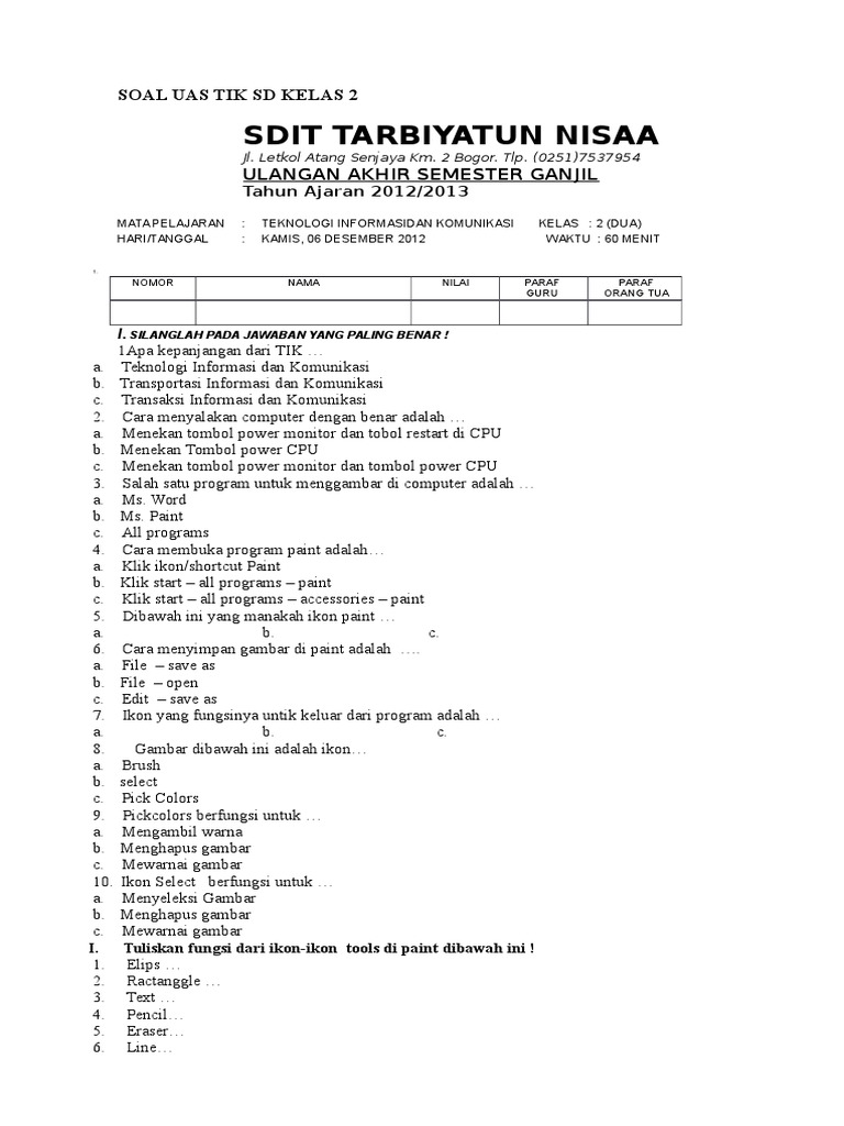 Soal Soal Uas Tik Sd Mi Semester 1 Kelas 1 6 Tahun Ajaran 2016