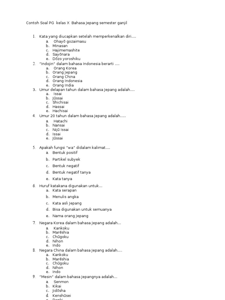 Kisi Kisi Pas Bahasa Jepang Kelas 10 Kurikulum 2013 Revisi 2019