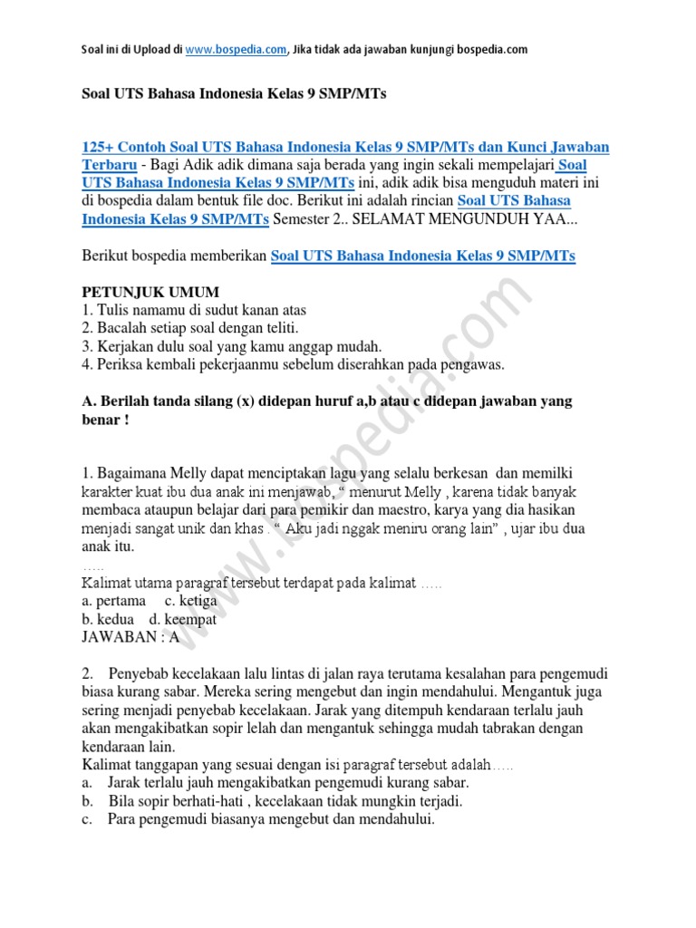125 Contoh Soal Uts Bahasa Indonesia Kelas 9 Smp Mts Dan