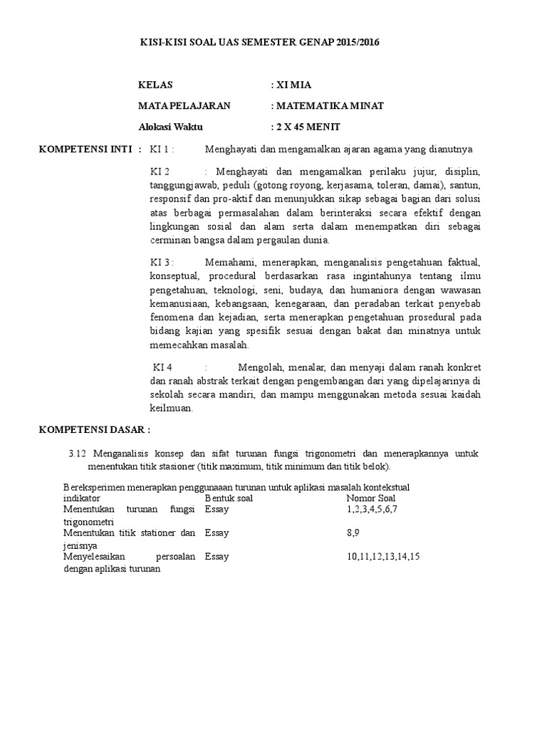 Doc Kisi Kisi Ujian Sekolah 2016 Matematika Peminatan Sma Jun