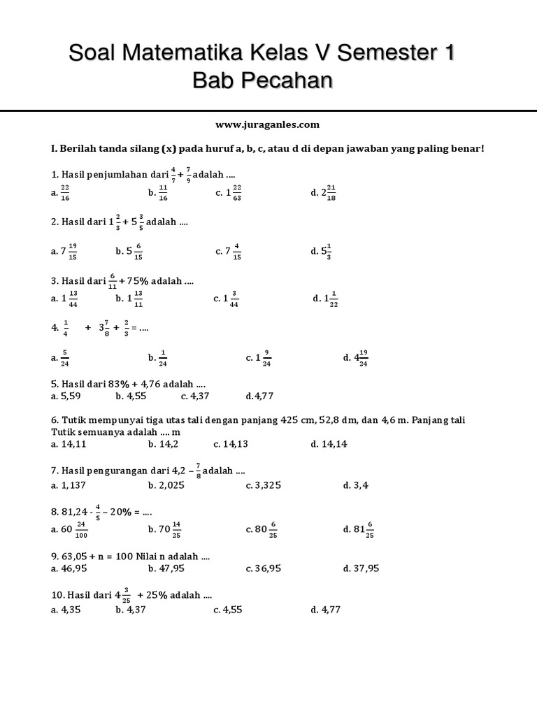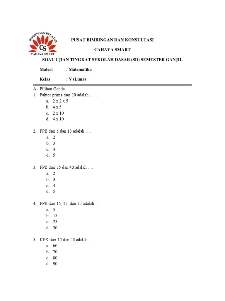 Contoh Soal Matematika Kelas 5 Sd Semester 1 2020