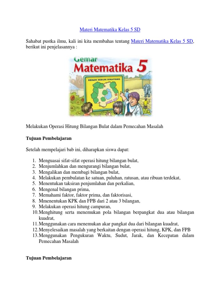 Simak di sini untuk persiapan pelajaran sd kelas 5. Materi matematika kelas 5 kurikulum 2013 revisi 2018 sahabat buku paket yang setia pada kesempatan kali ini kami akan berbagi materi pelajaran matematika untuk kelas 5 sdmi kurikulum 2013 hasil revisi terbaru 2018.