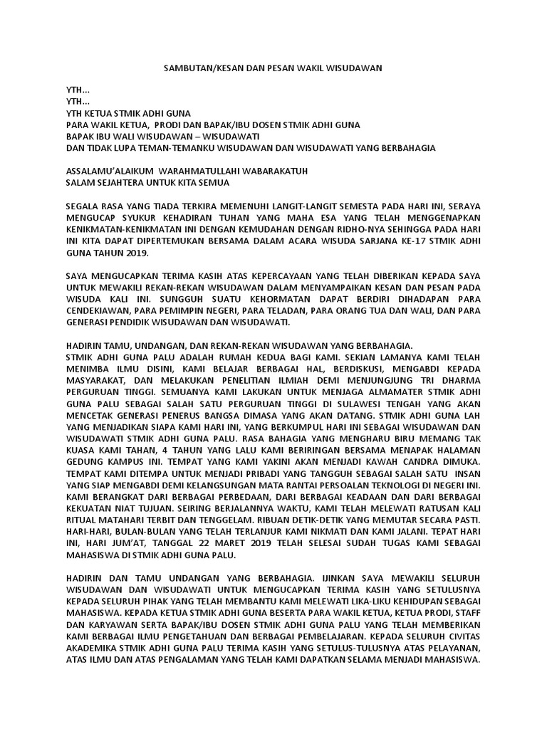 Share artikel ini agar teman anda juga mendapatkan ide untuk menulis pesan dan kesan terbaiknya. Banyak bidang yang harus digarap untuk menyelesaikan persoalan persoalan yang ada. Alhamdulillah terima kasih saya ucapkan ke kampus stie ahmad dahlan jakarta karena saya diberikan kesempatan untuk mewakili wisudawanwisudawati dihari wisuda saya untuk menyampaikan kesan dan pesan.