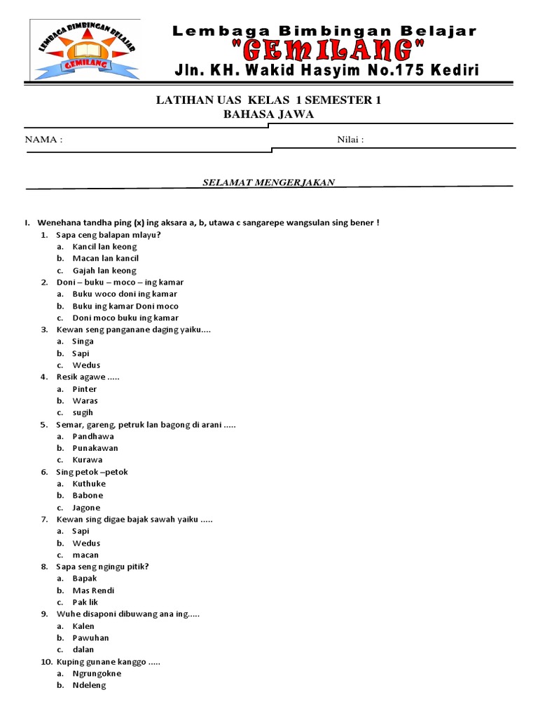 Soal ulangan mata pelajaran bahasa jawa kelas 1 dari soal pilihan ganda isian singkat dan uraian. Sari kusuma ningrum 2. Pada kesempatan kali ini akan kami bagikan contoh latihan soal uts ulangan tengah semester 1 ganjil kelas 123456 sd mapel bahasa jawa dan kunci jawaban kurikulum 2006 ktsp.
