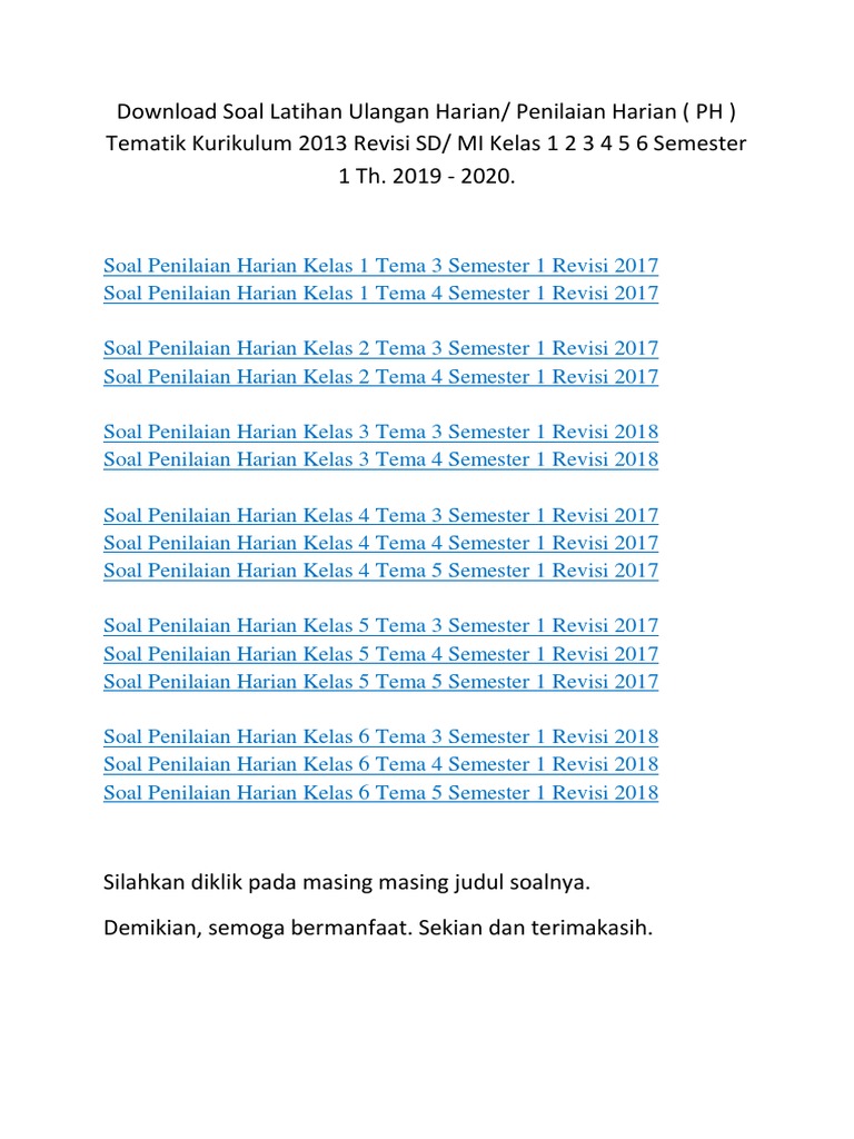 Download Penilaian Harian Tematik Kelas 1 2 3 4 5 6 Semester 1