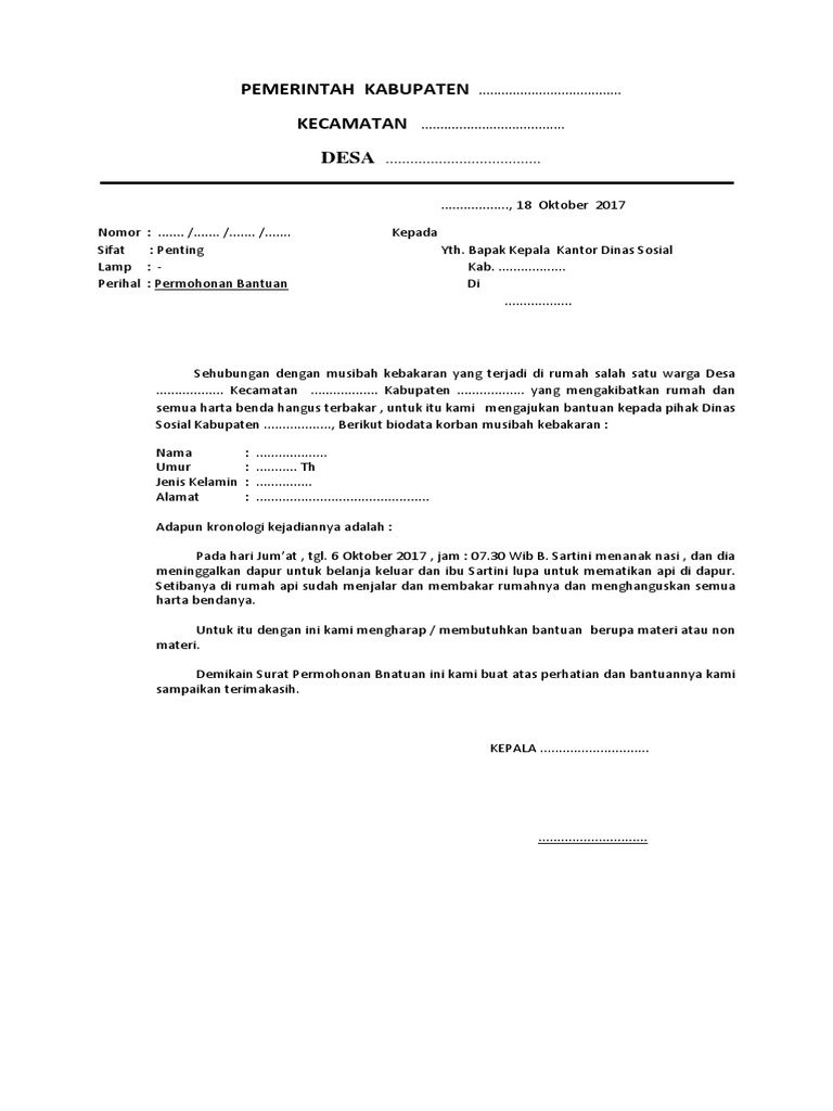 Contoh Surat Permohonan Bantuan Dana Musibah Kebakaran