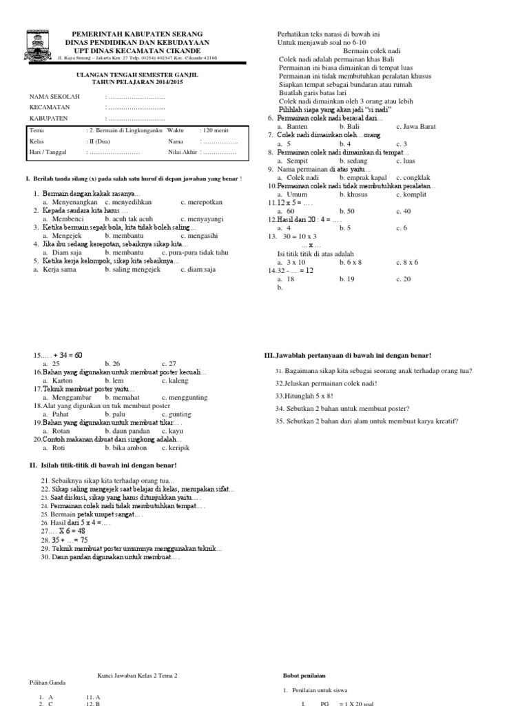 Soal Pts Kelas 2 Tema 2 Bermain Di Lingkunganku Revisi 2017