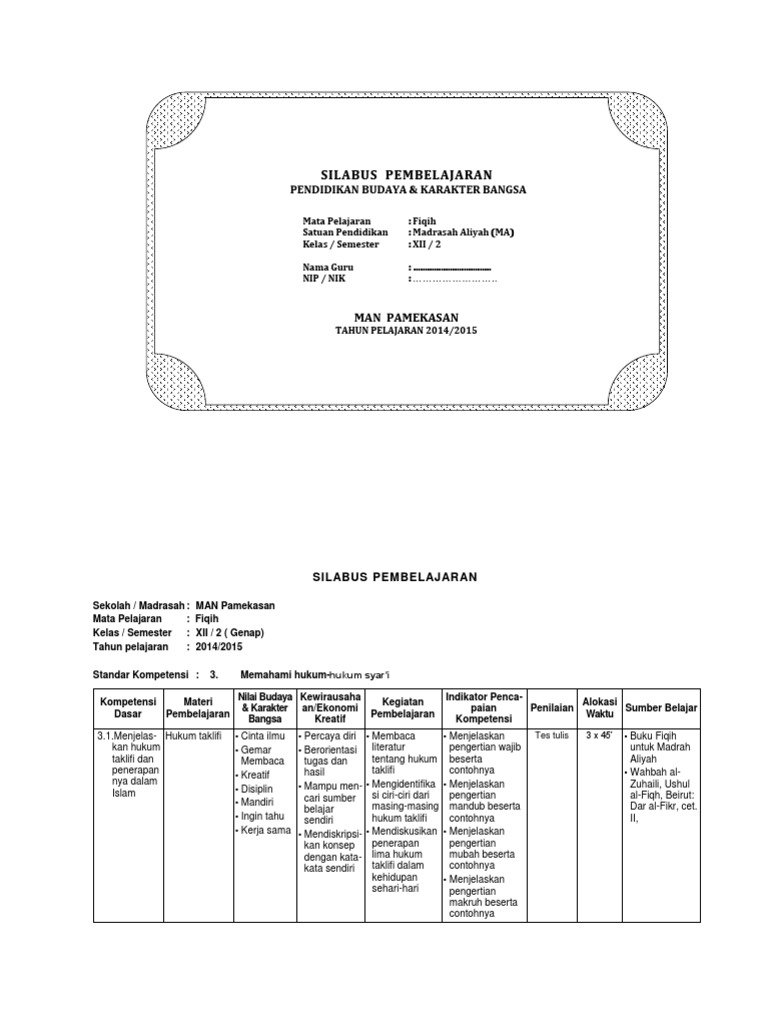 Silabus fiqih ma k13 revisi 2017 ini merupakan perangkat yang sangat penting dalam suatu pembelajaran karena akan menjadi dasar dalam pembuatan perangkat pembelajaran lainnya seperti prota promes dan rpp.