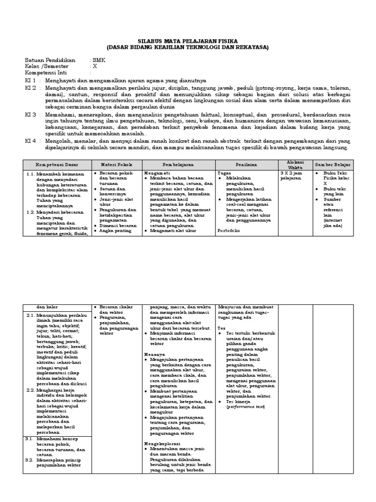 Silabus Fisika Smk Kelas X Kurikulum 2013