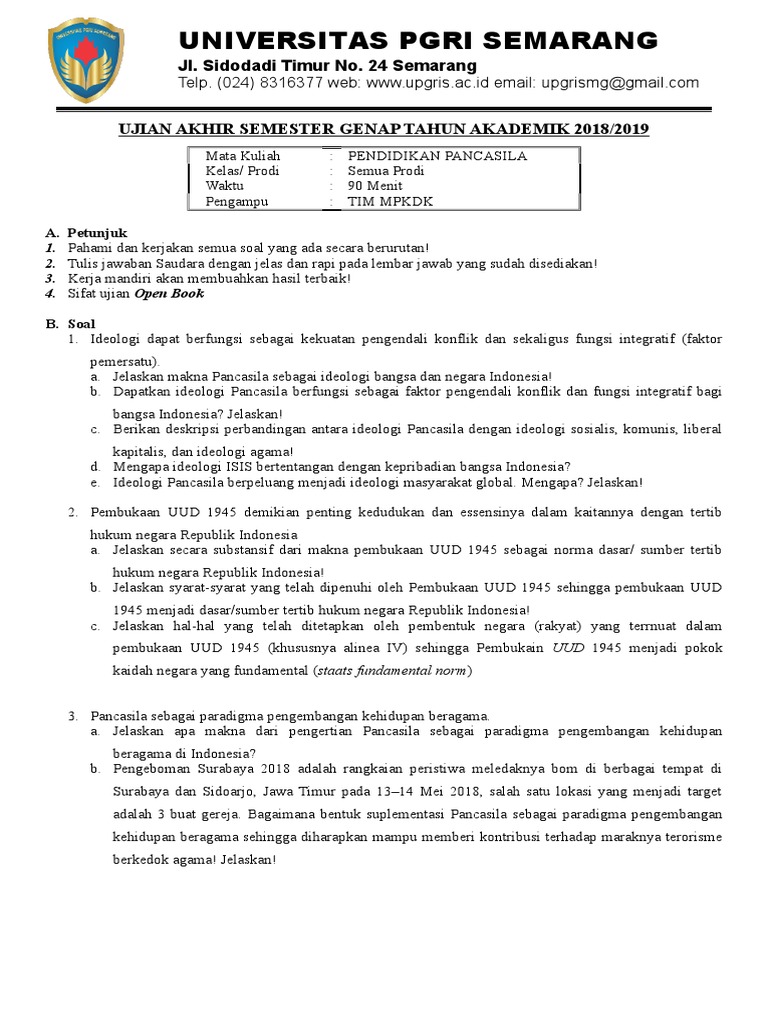 Contoh Soal Dan Jawaban Mata Kuliah Pendidikan Pancasila Semester 1