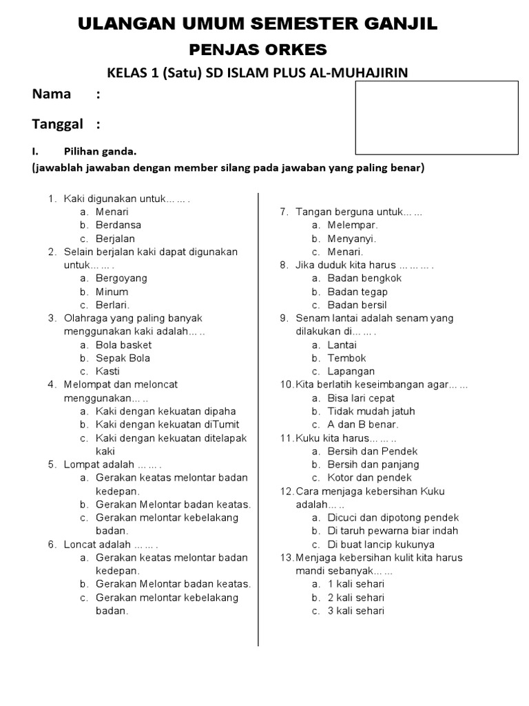 Kelas 1 Satu Sd Islam Plus Al Muhajirin Nama Tanggal Penjas Orkes