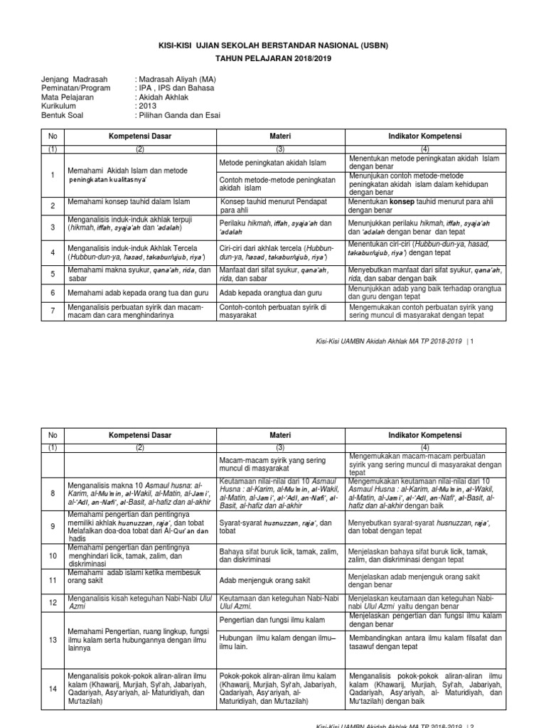 3 Kisi Kisi Usbn Akidah Akhlak Ma Pdf