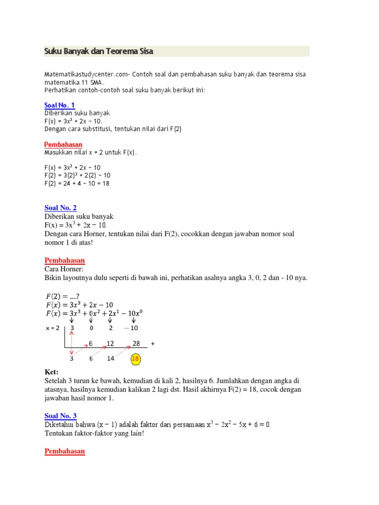 Suku Banyak Pembagian Teorema Sisa Teorema Faktor Contoh Soal