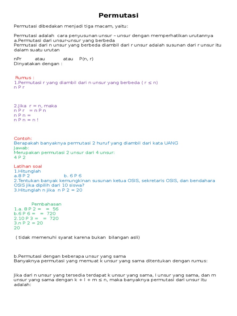 Jika tidak percaya bisa dilihat contoh soal dan pembahasan permutasi unsur yang sama berikut ini. Permutasi dapat dikelompokkan menjadi beberapa macam. A pada kata rasakan terdapat 7 huruf.
