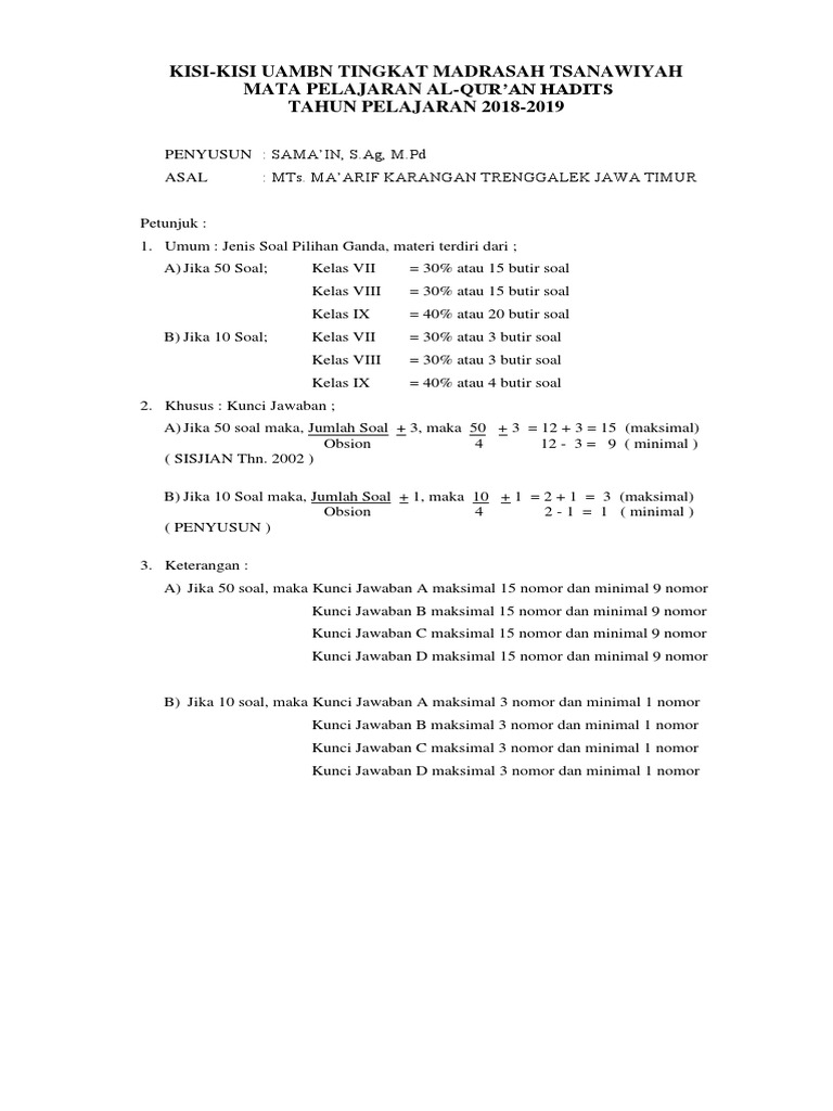 Contoh Kisi Kisi Dan Soal Uambn Mts Qur Dis 2019 Docx