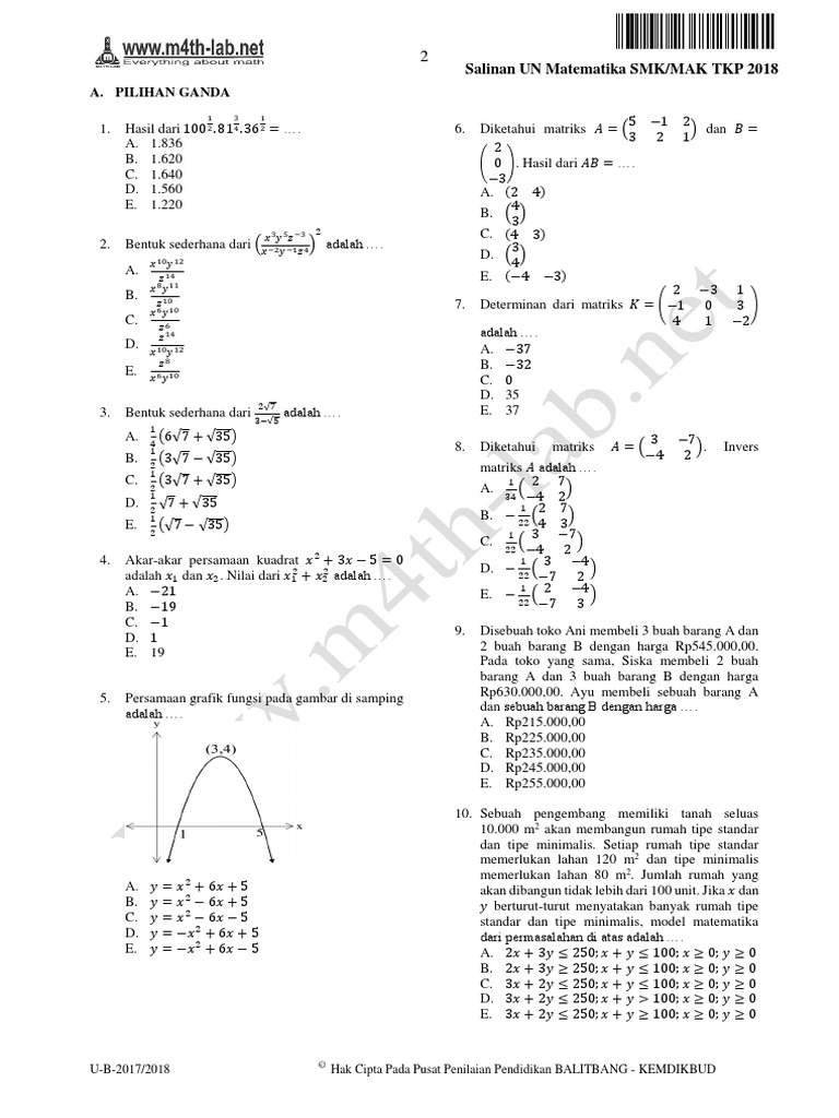 Contoh Soal Dan Jawaban Un Matematika Smk 2018