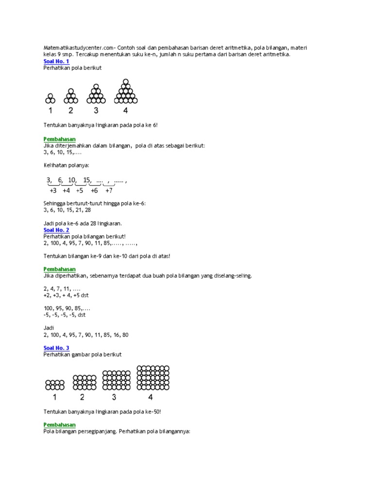 Posting pada rumus matematika smp ditag contoh latihan soal barisan dan deret aritmatika contoh soal barisan aritmatika dalam kehidupan sehari hari contoh soal barisan dan deret aritmatika dan penyelesaiannya contoh soal barisan dan deret beserta jawaban contoh soal deret angka contoh soal deret aritmatika dan jawabannya contoh soal pola bilangan kelas 9 soal barisan dan deret. Macam macam pola bilangan pola bilangan merupakan sub bab dari materi barisan bilangan atau bab yang perlu di fahami terlebih dahulu sebelum melanjut pada materi barisan aritmatika dan barisan geometri.