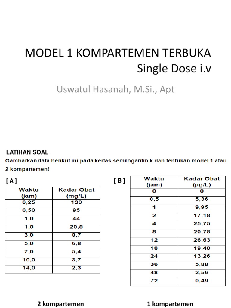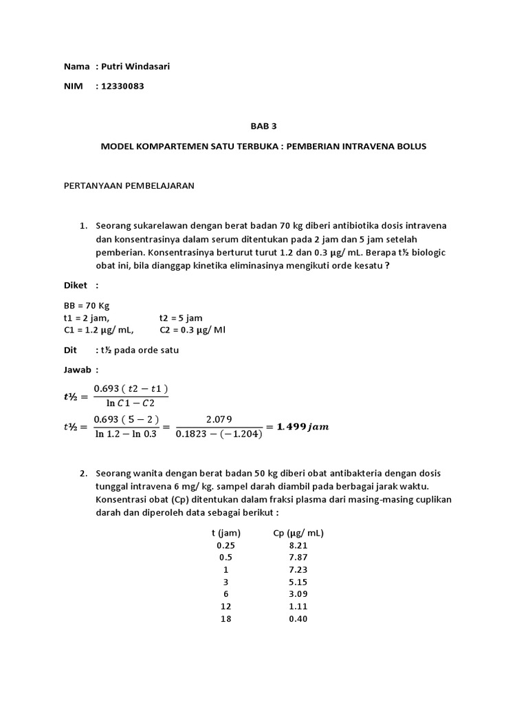 Farmakokinetik Soal Dan Jawaban Docx Nama Putri Windasari Nim 12330083 Bab 3 Model Kompartemen Satu Terbuka Pemberian Intravena Bolus Pertanyaan Course Hero