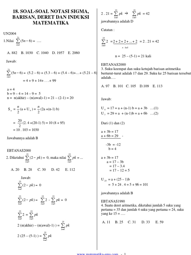 Soal Soal Notasi Sigma Barisan Deret Dan Induksi Matematika Pembahasan