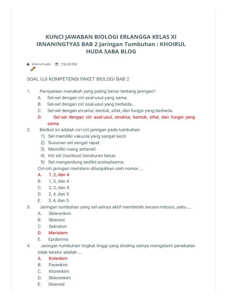 Kunci Jawaban Biologi Soal Biologi Kelas