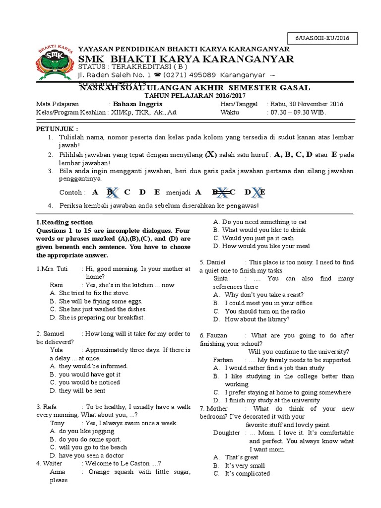 Soal UAS Bahasa Indonesia SMASMK Kelas XXIXII Semester 1 20172018. Contoh Kop Soal Ulangan Kunci Dunia. Pembahasannya kurikulum 2013 uts uas ukk.