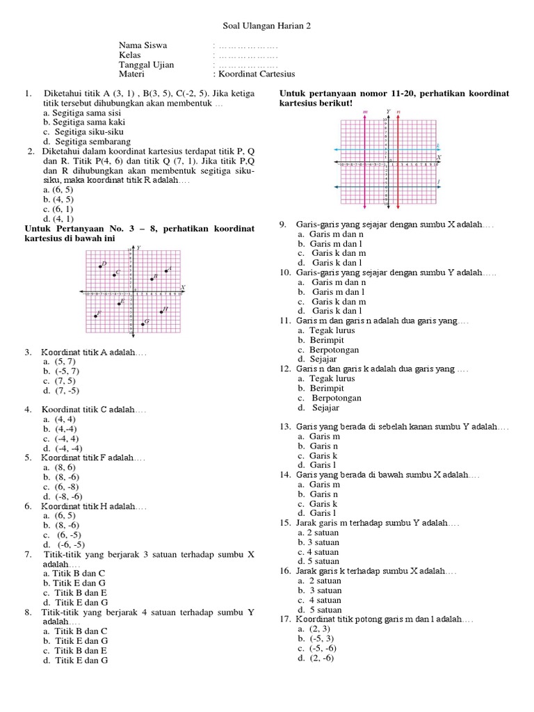 Soal Ulangan Harian Mtk Kelas 8 Tentang Koordinat Cartesius Kurikulum 2013
