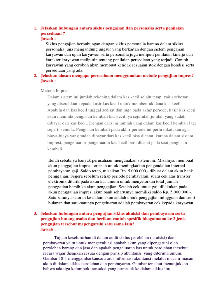 Kunci jawaban audit siklus akuisisi modal dan pembayaran. Soal Dan Jawaban Audit. Siklus akuisisi modal dan pembayaran kembali berfokus pada akuisisi sumber daya modal melalui utang berbunga dan ekuitas pemilik dan pembayaran kembali modal tersebut. KATA PENGANTAR Puji dan syukur kami panjatkan kepada Allah SWT yang telah memberikan rahmat hidayah dan inayah serta nikmat diantaranya adalah nikmat sehat sehingga kami dapat menyelesaikan tugas makalah Auditing dengan ruang lingkup pembahasan Audit Siklus Akuisisi Modal dan Pembayaran Kembali.