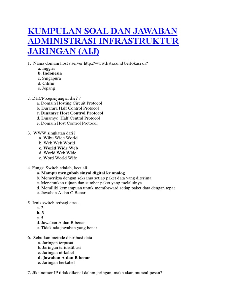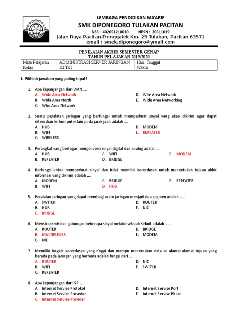Berbagiruang Berikut adalah kumpulan latihan soal Mata Kuliah Administrasi Jaringan Komputer yang terdiri dari 50 soal pilihan ganda. Mengetahui ip address e. Download Soal Dan Jawaban Administrasi Server Kelas 11 PDF 1200 MB - SamPDF Unduh Soal Dan Jawaban Administrasi Server Kelas 11 PDF secara gratis di SamPDF.