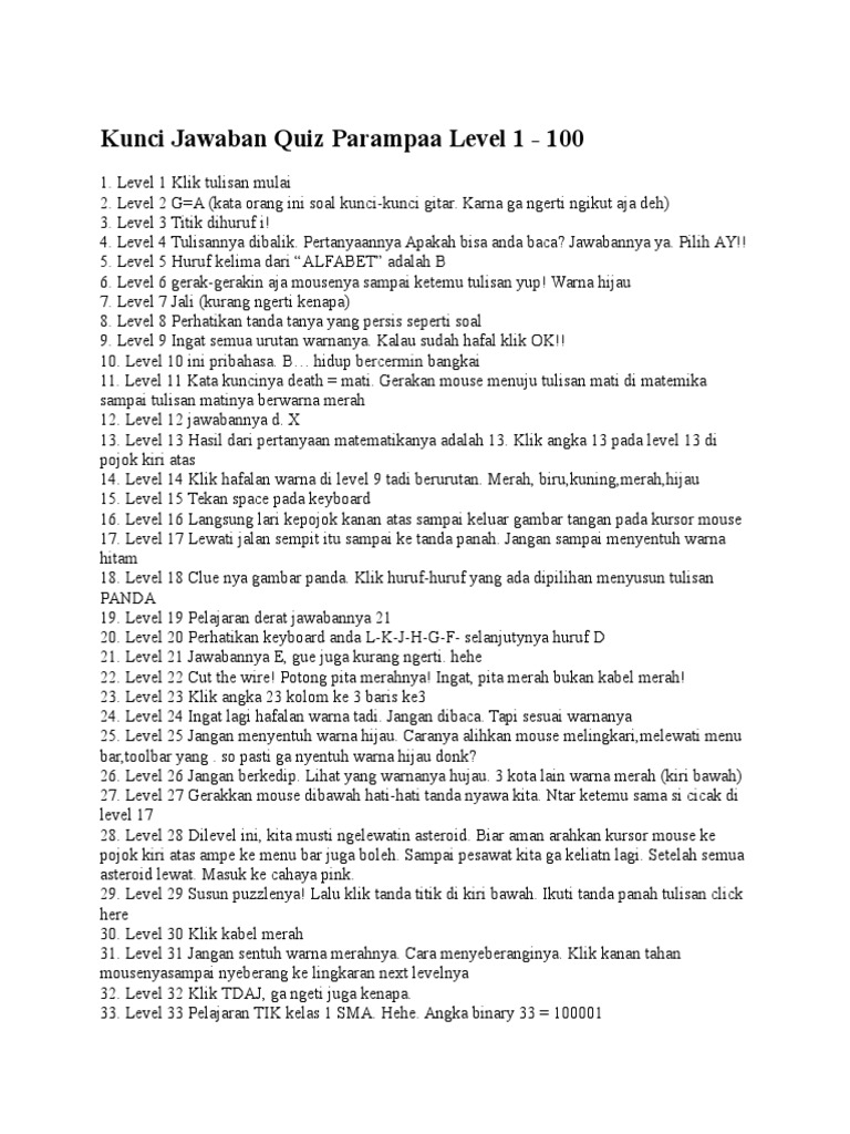Jawaban quiz parampaa 2 level 101 203 ver 1 75 agustus 29 2011 0. October 28 2013 at 4 09 am. Kunci jawaban quiz parampaa level 1 100 1.