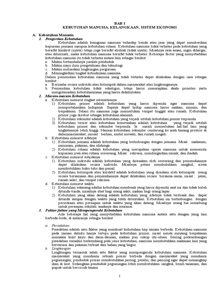 Kebutuhan Manusia Tingkat Sifat antara lain kebutuhan Jasmani dan Rohani. Kebutuhan Manusia Tingkat Wujud yang terdiri atas kebutuhan materian dan immaterial. Uraikan kelebihan dan kelemahan sistem ekonomi pasar.