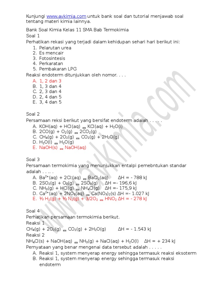 Bank Soal Kimia Kelas 11 Sma Bab Termokimia