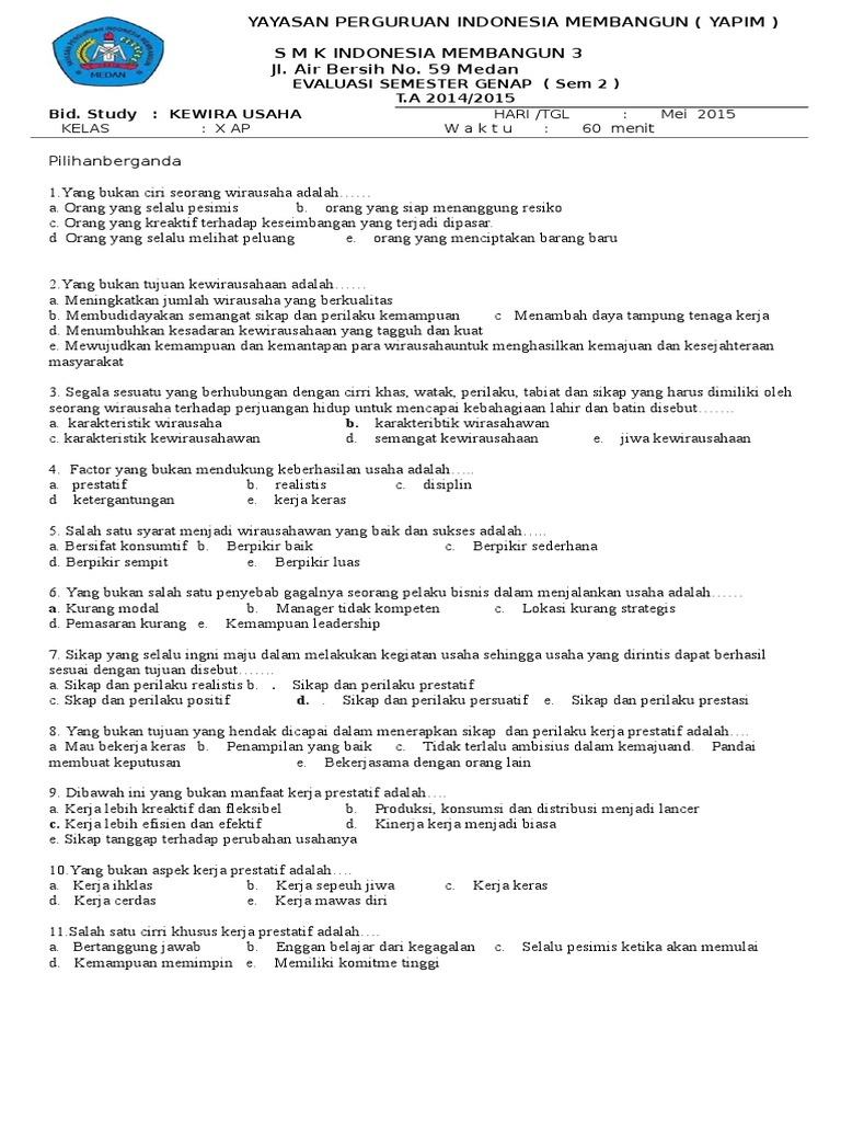 Imitasi dan kereatif b. Duplikasi dan kereatif 2. Soal kewirausahaan kelas xi semester 1 soal uts kewirausahaan kelas xi beserta jawabannya contoh kewirausahaan xi seni budaya sma smk semester 1 berikut ini adalah soal kwu semester ganjil yang telah saya peroleh ketika saya masih kelas xi smk di soal.