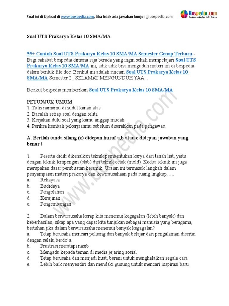Lengkap 55 Contoh Soal Uts Prakarya Kelas 10 Sma Ma Semester Genap Terbaru Bospedia