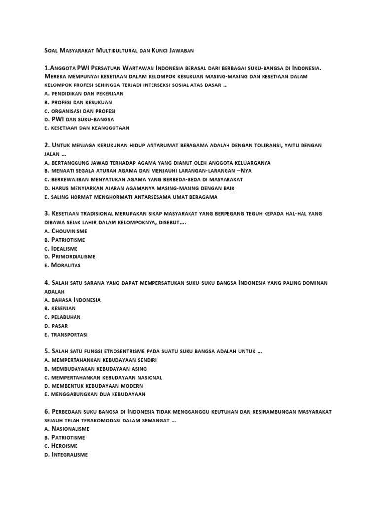 Soal juga dilengkapi dengan kunci jawaban. SOAL DAN JAWABAN MULTI KULTURAL 1. Soal tentang masyarakat multikultural soal sosiologi yang akan dibagikan kali ini adalah soal sosiologi tentang masyarakat.