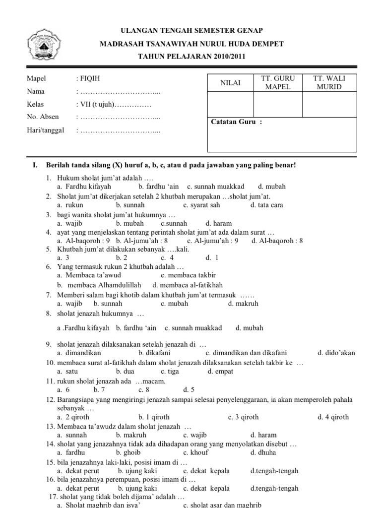 Soal Fiqih Kelas 7 Semester 1 Dan Kunci Jawaban Guru Galeri