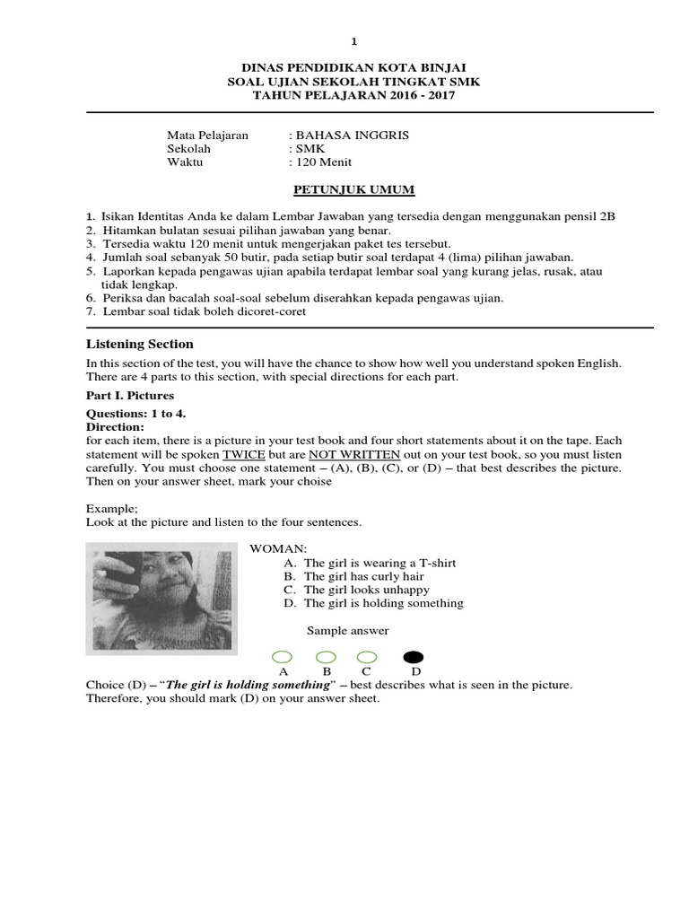 Soal Listening Bahasa Inggris Smk Un 2016 Dan Pembahasannya Bahasa Inggris Bahasa Inggris. Naskah asli Audio jelas Gambar berwarna Pembahasan Kunci Jawaban dan Transkrip. Soal try out ke-1 unbk bahasa inggris sma tahun 2017 dki jakarta.