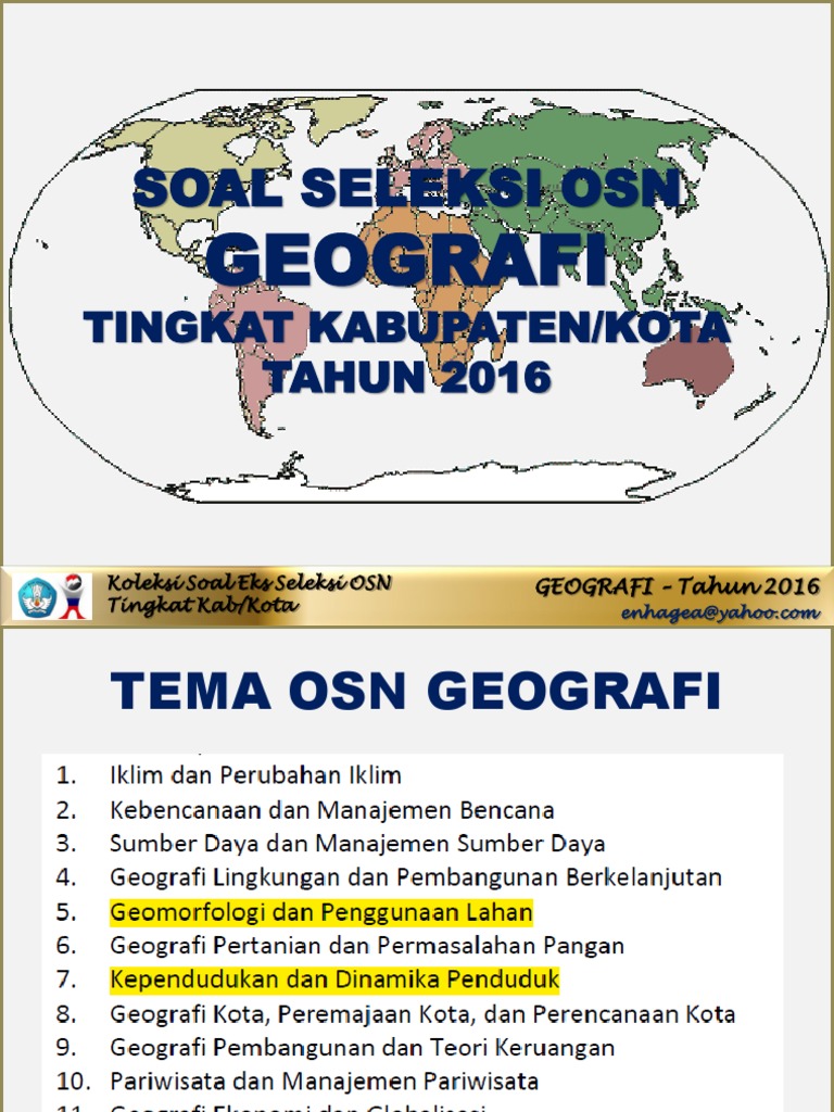 20200130 DOWNLOAD SOAL. 20190728 Download Geografi Pada laman ini anda dapat mengunduh materi soal pembahasan maupun latihan soal mata pelajaran geografiDiharapkan berkas-berkas yang ada dapat digunakan sebaik-baiknya sebagai sumber. Dibawah ini adalah download soal jawaban pembahasan osn sma geografi 2018 tingkat kabupaten provinsi dan nasional.