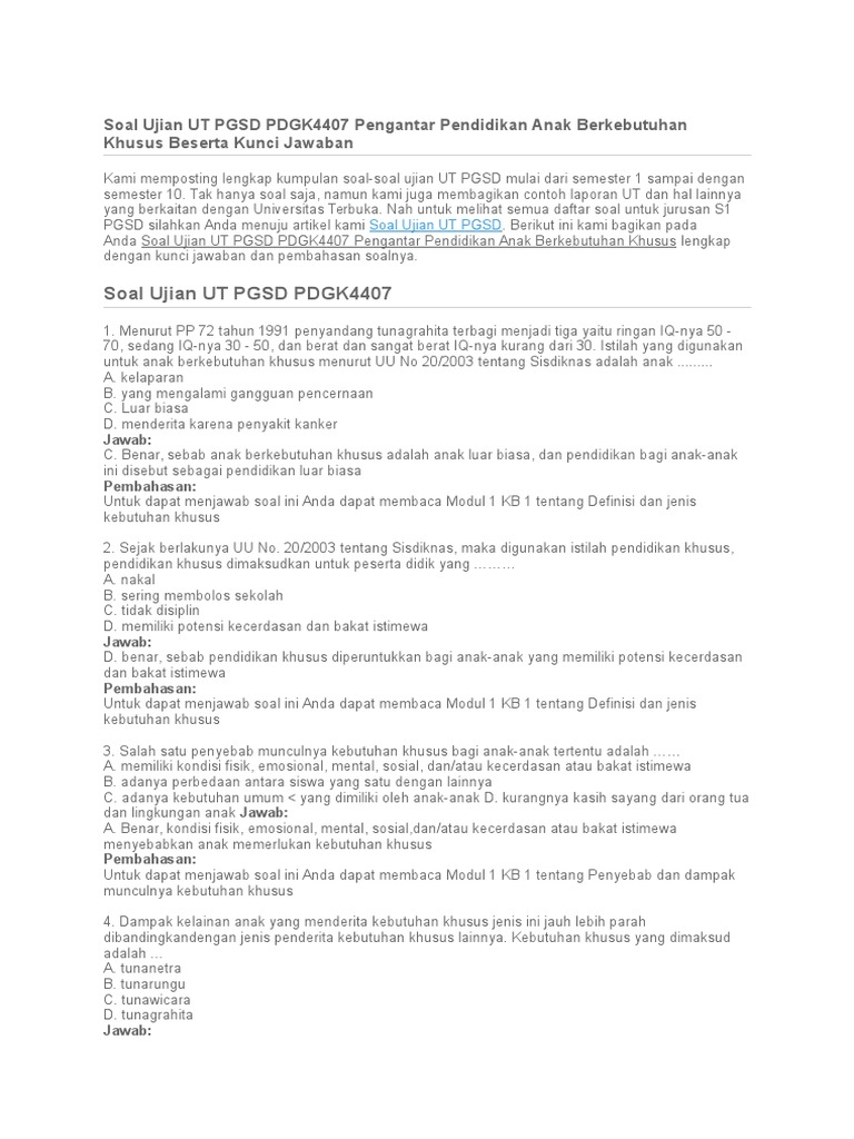 Secara lebih halus kita dapat menyebutnya sebagai anak berkebutuhan khusus yang dalam. Soal Ujian Ut Pdgk 4503 Materi Dan. 20200825 Universitas Terbuka UT menyediakan soal-soal latihan Gratis bagi mahasiswa sebagai salah satu persiapan dalam menempuh ujian.