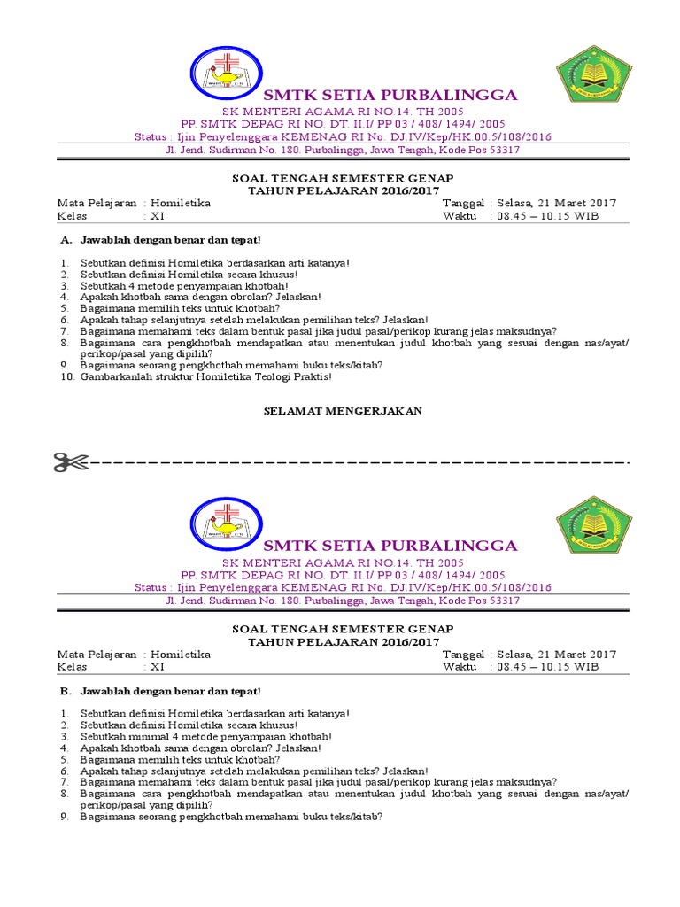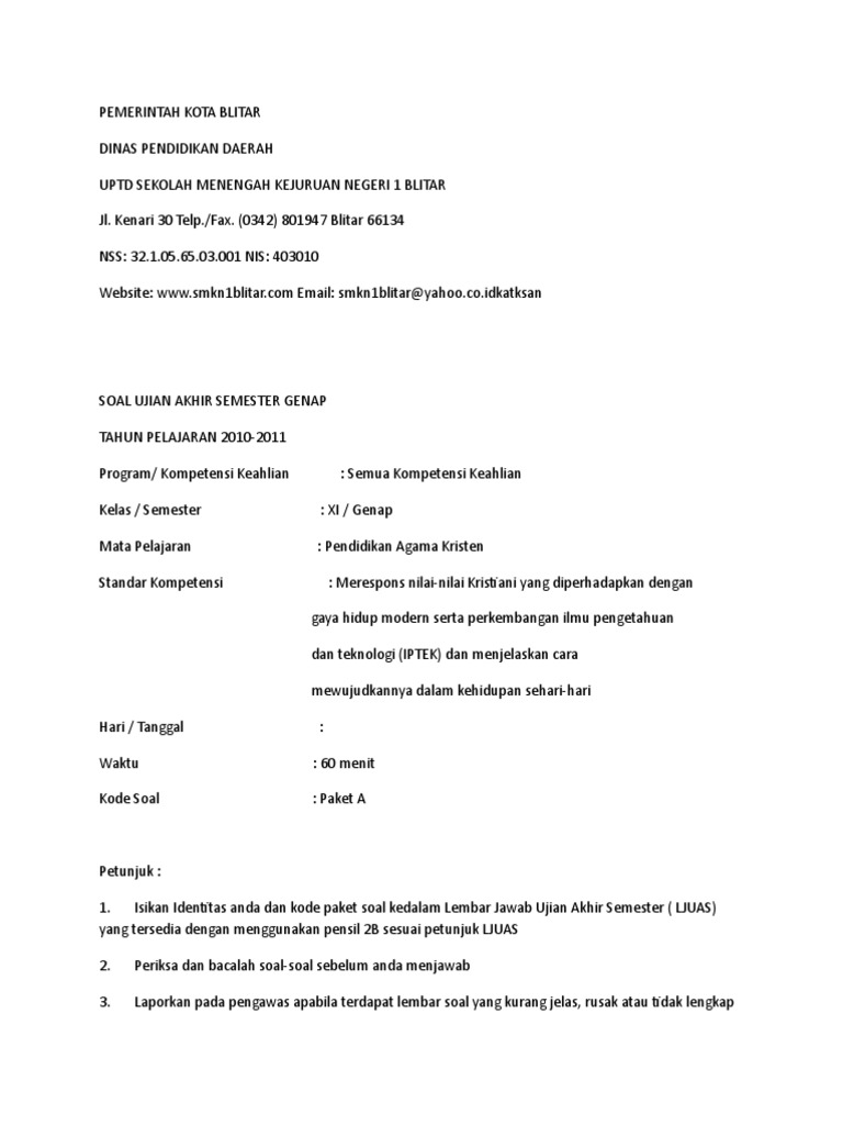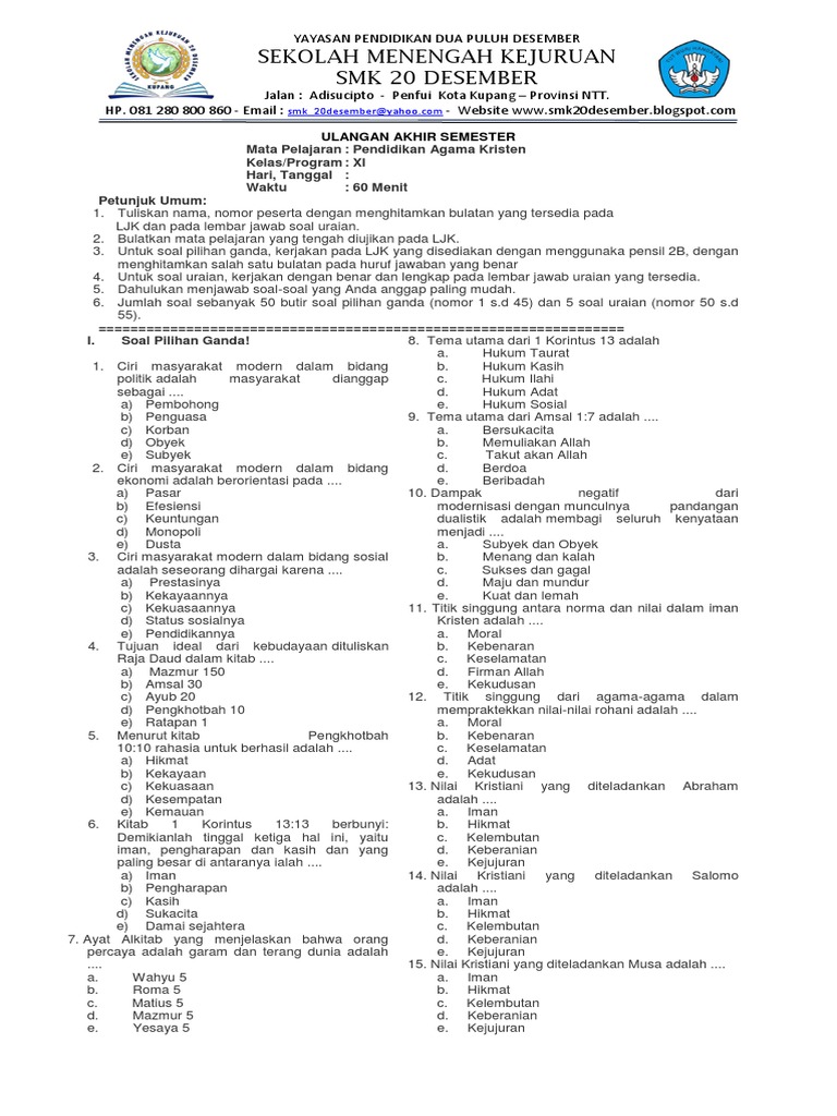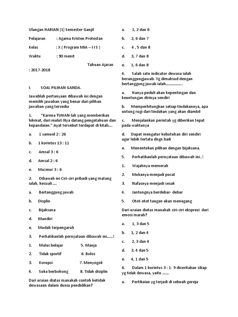 Soal Contoh Ulangan Harian Semester Agama Kristen Kelas X