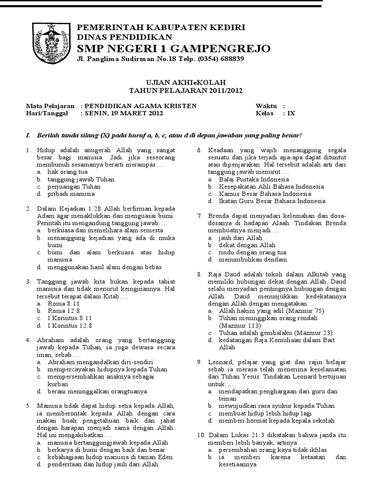 Soal Agama Kristen 2015 Kelas Xii