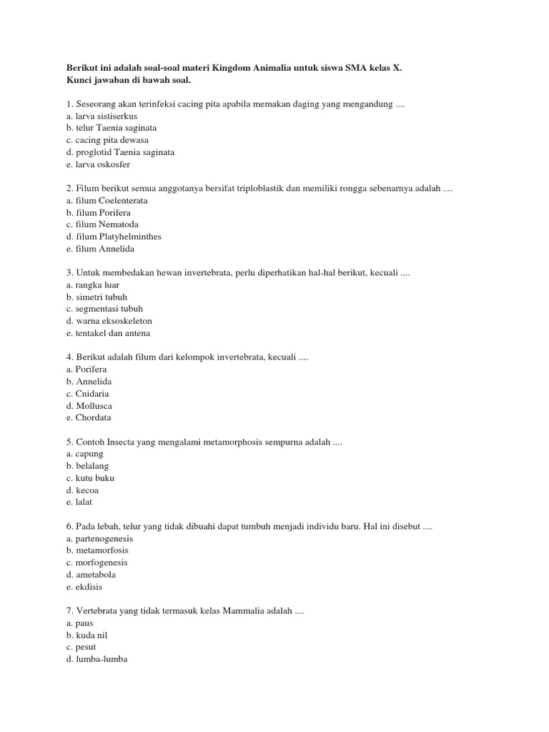 Soal Dan Kunci Jawaban Ulha Biologi Animalia Sebab Akibat