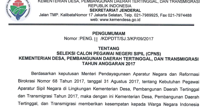 Pengumuman Hasil Seleksi Administrasi Kemendesa Penerimaan Cpns 2017