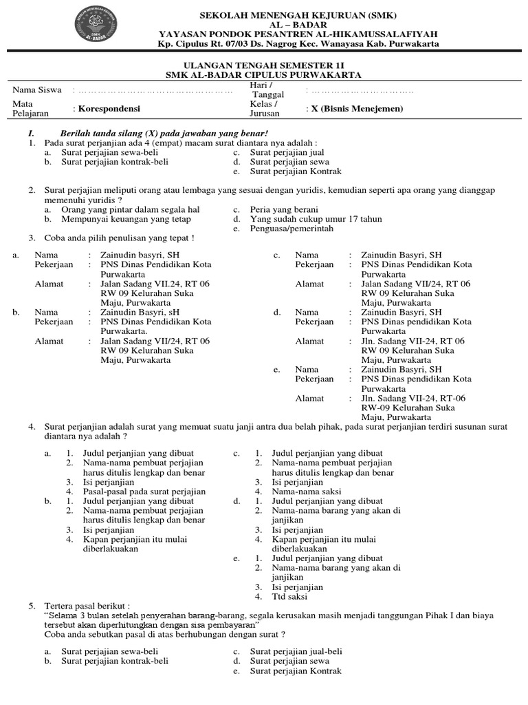 20210213 Contoh soal kewirausahaan kelas 10 semester 1 dan semester 2 kurikulum 2013 beserta kunci jawaban nya lengkap dan terbaru soal pilihan ganda dan esay. 20180928 Berikut bospedia memberikan Soal UTS Penjaskes Kelas 10 SMAMA PETUNJUK UMUM 1. 1 日前 Download Soal Dan Jawaban Kearsipan Kelas 10 Semester 2 PDF 2000 MB - SamPDF SamPDF niaga wisata korespondensi niaga bahasa indonesia korespondensi nabi dengan para raja korespondensi naskah dinas.