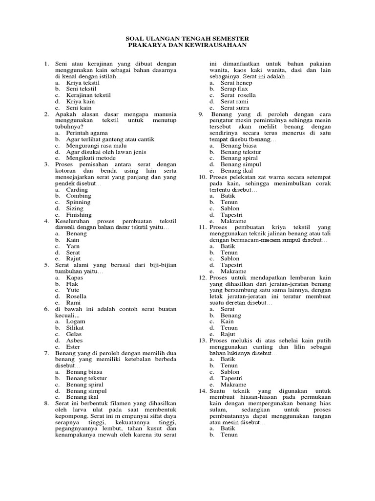 Soal Pilihan Ganda Dan Essay Bab1 Kerajinan Dan Wirausaha Tekstil