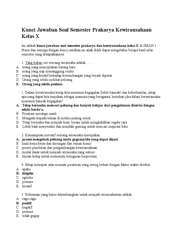 Kunci Jawaban Soal Semester Prakarya Kewirausahaan Kelas X