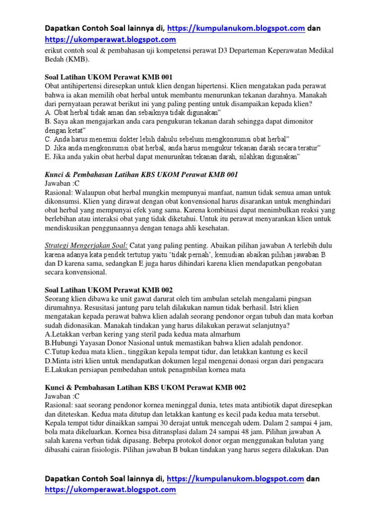 Sep 05 2020 Contoh soal uji kompetensi ukom kasus keperawatan medikal bedah kmb dan kunci jawaban berikut ini adalah latihan uji kompetensi perawat ukom kmb bagian ke 175 beserta kunci jawabannya serta pembahasannya hai halo teman teman semuanya apa kabar kalian yang dari sabang sampai merauke saya harap kalian baik baik saja yaa dan teteap fit serta. Download Soal Uji Kompetensi Perawat 2017 Pdf PDF 1800 MB - SamPDF SamPDF Trik SUKSES dan mudah Menjawab Soal UKOM TrikSuksesUkom Suksesukom Di publikasikan pada tanggal 24 Juni 2020 Terimakasih sudah mendukung kami dengan. Nov 13 2017 SOAL-SOAL UKOM NERS DAN PEMBAHASANNYA 1.