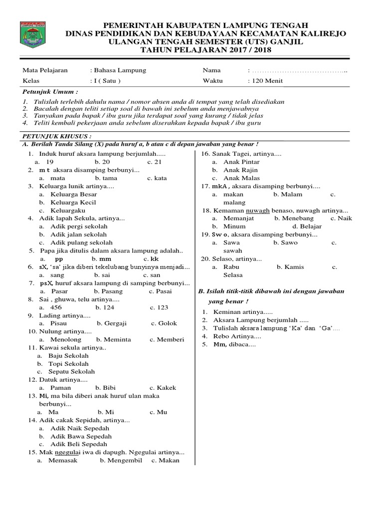 Soal Uts Bahasa Lampung Kelas 4 Sd Semester 1