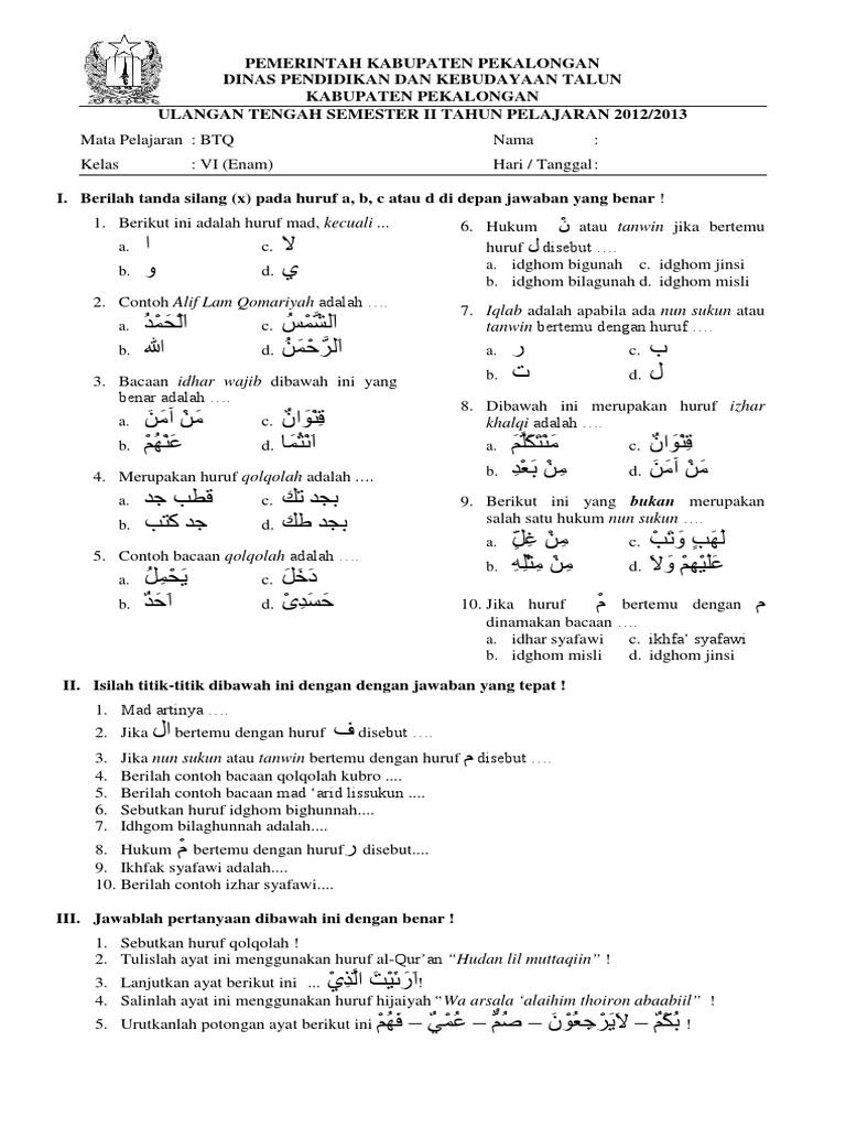 20201213 Soal uas kelas 1 btq semester 2 sealamat datang saya haturkan di bawah ini ada beberapa soal baca tulis al qura an btq kelas 1 semester 2 yang terdiri dari pil. Bank Soal Download SMPtembang jawa kelas 1 sd soal agama katolik smp kelas 8 semester 1 kurikulum 2013 soal uts btq kelas 6 semester 1. Terima kasih demikianlah soal uts matematika kelas 5 semester 2.
