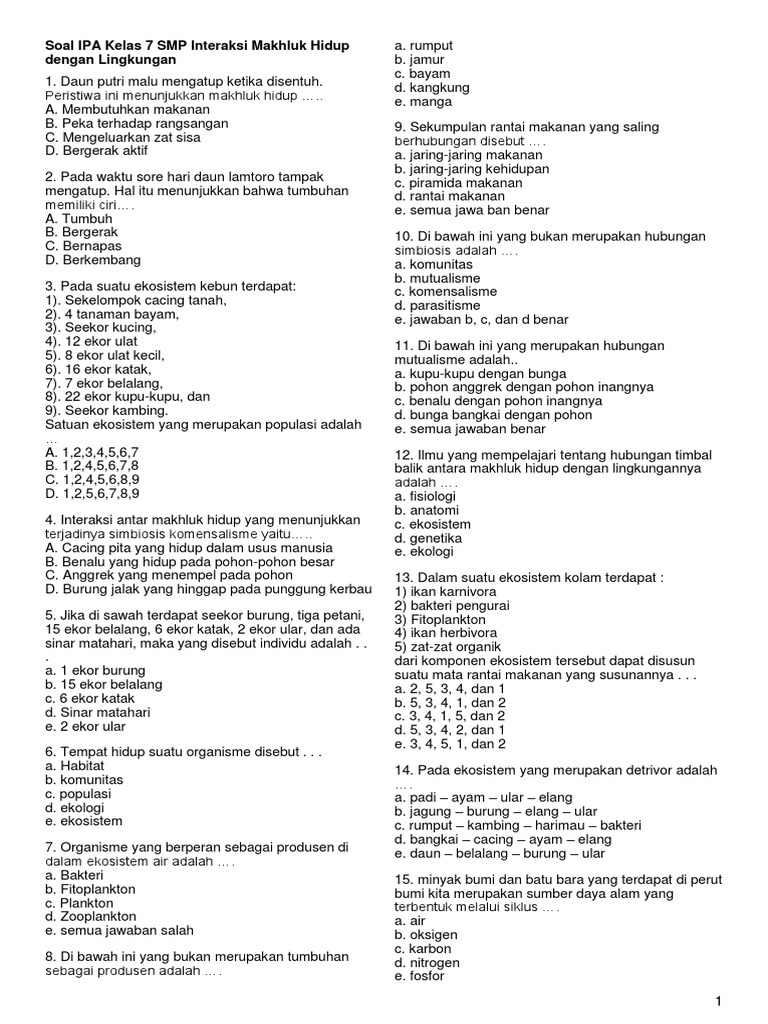 Soal Ipa Kelas 7 Smp Interaksi Makhluk Hidup Dengan Lingkungan Murid